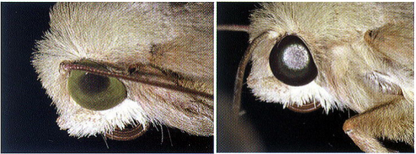 黃色波段燈利用昆蟲復眼的綠-黃光感受器的生物學功能。夜出型蛾類的復眼在白天為明適應狀態(左上圖),夜間為暗適應狀態(右上圖)。